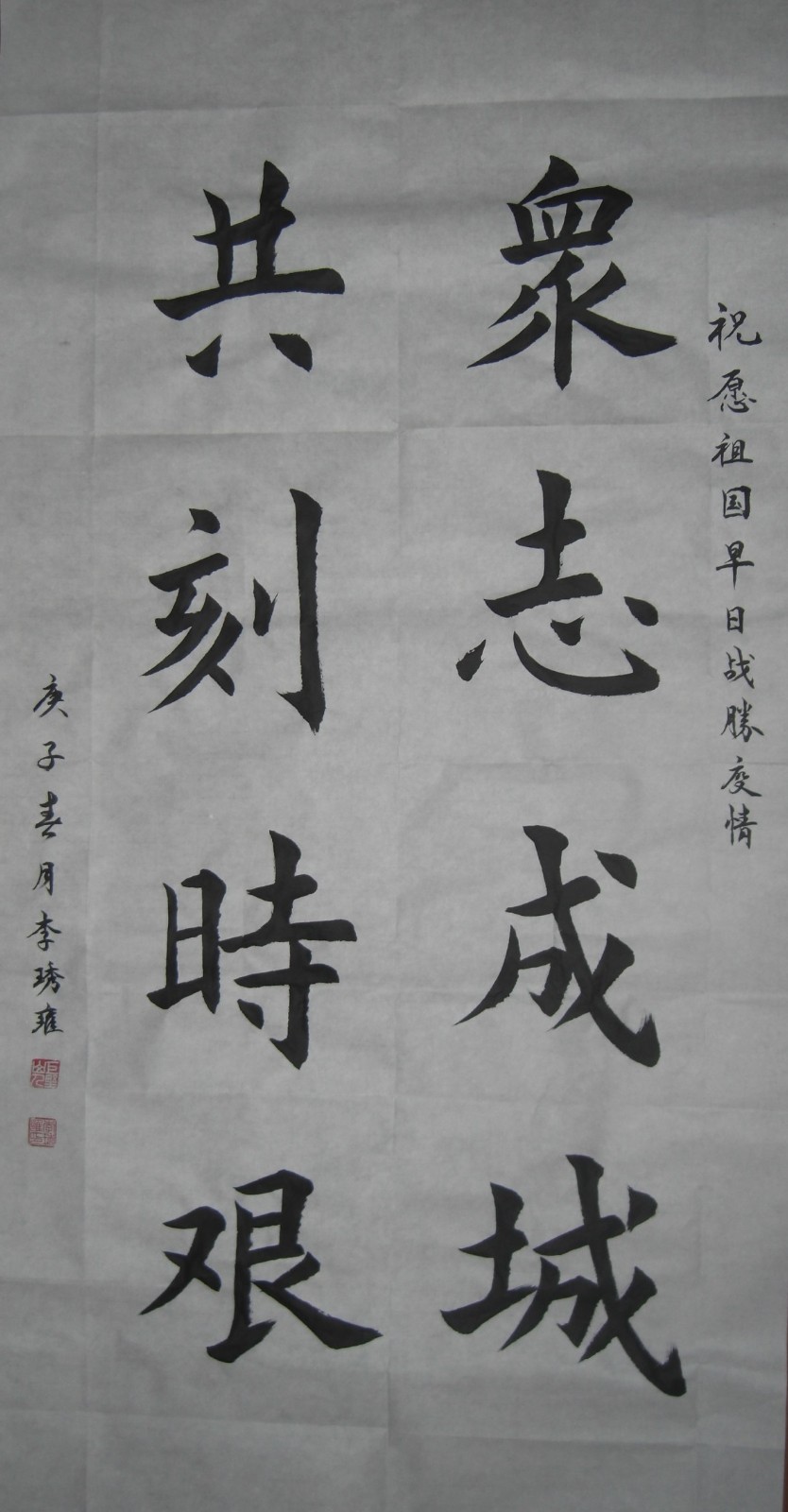 当前,全国人民众志成城,全力以赴地投入到疫情防控阻击战中。济南市硬笔书法家协会积极响应党中央、国务院的号召,认真贯彻中国硬笔书法协会疫情防控“倡议书”的指示精神,适时组织了“会员爱心助力、书法鼓舞人心”网络书法活动,本次活动以弘扬社会正能量,助力打赢疫情防控战为主题,紧紧围绕阻击新型冠状病毒疫情为内容,作者以书法作品的形式反映人民群众众志成城、共克时艰与疫情作战的决心和意志,为战胜疫情作出自己的努力和贡献。