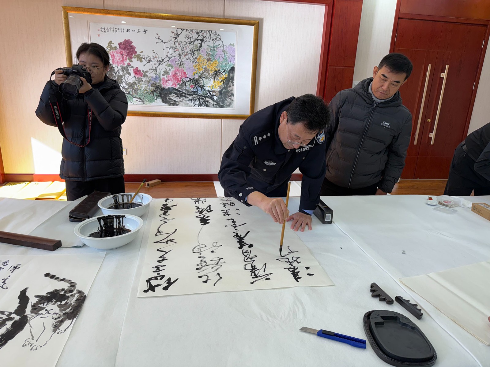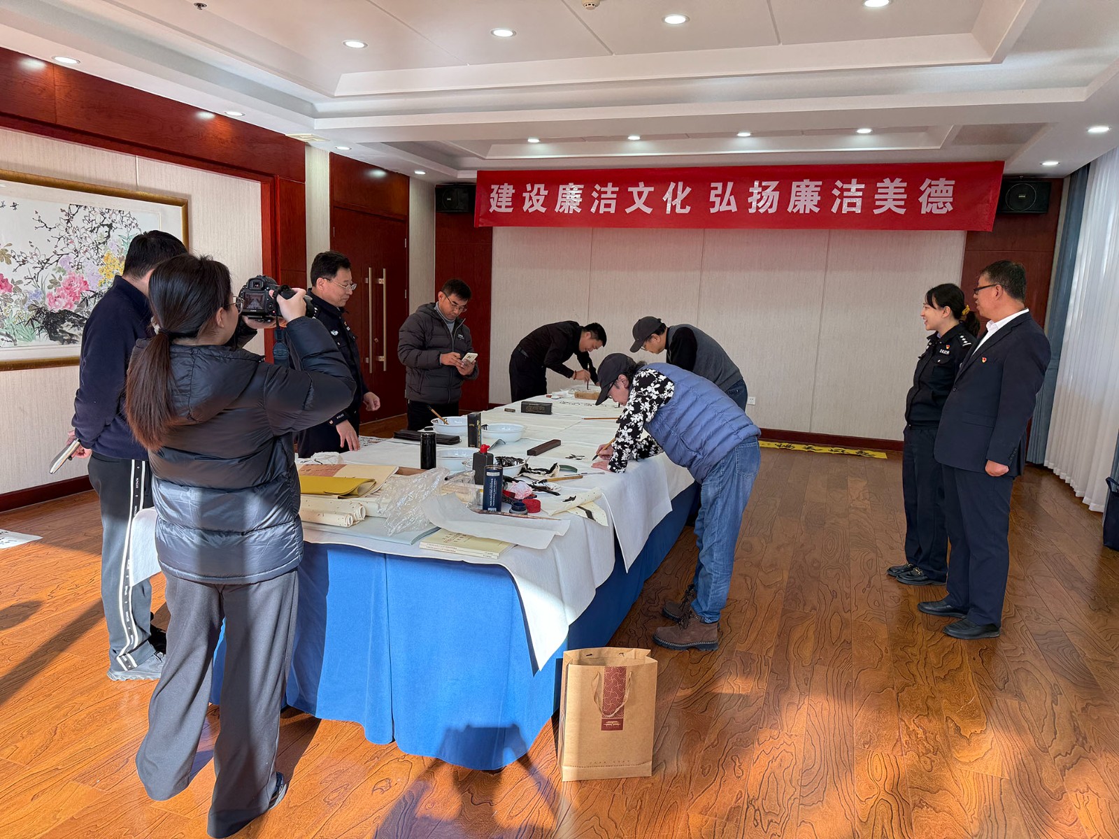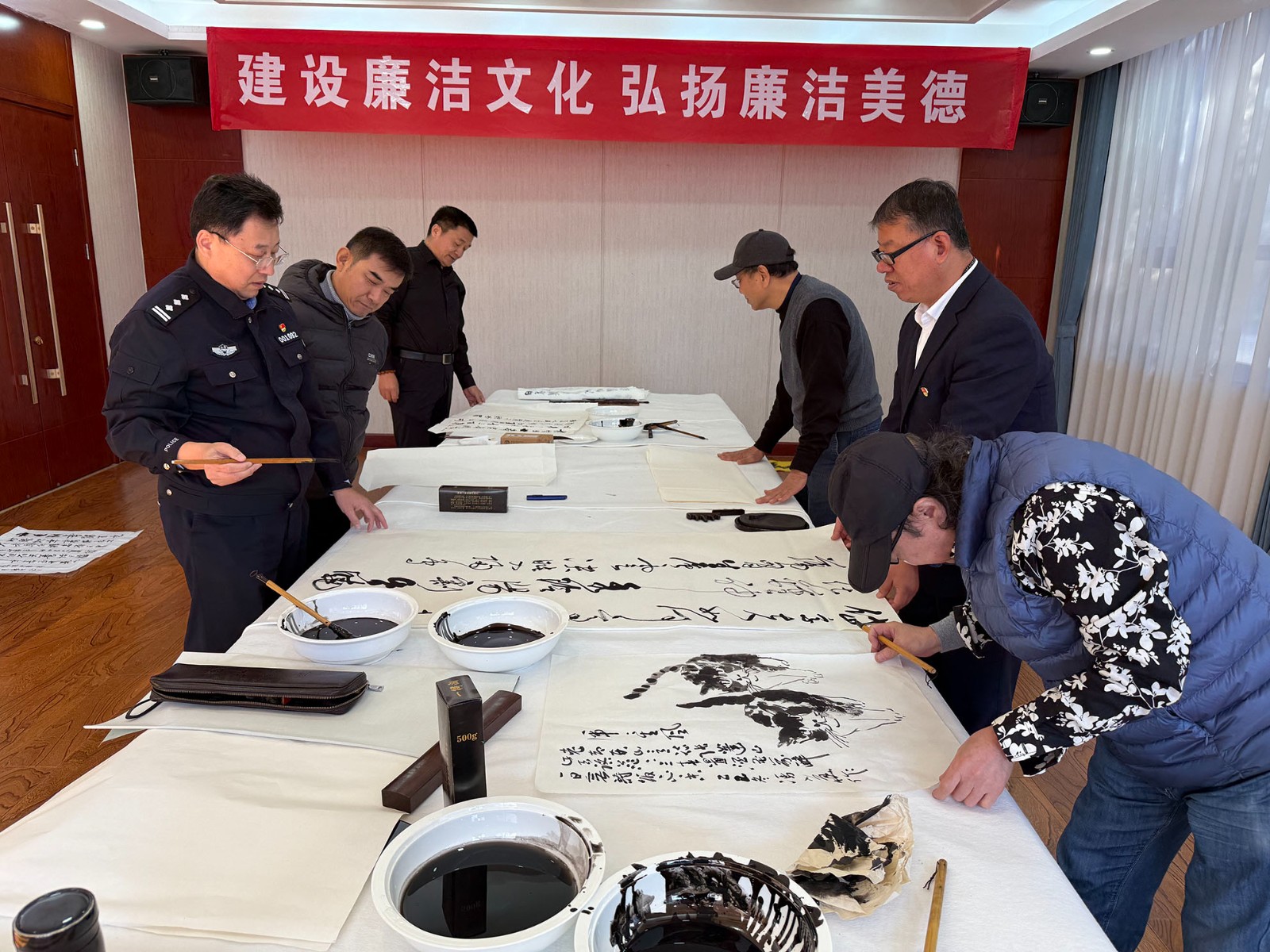 本次活动由协会党支部书记刘永和、会长宋嫘嫘带队,副主席冯少华、郭立、刘汝文、孔庆波一同参加。活动现场笔墨飘香、氛围庄重,书法家们以笔为媒,将廉洁理念与书法艺术深度融合,即兴挥毫创作了一批主题鲜明、笔力遒劲的作品。“清风劲节”“廉润警心”“忠诚担当”等一幅幅作品,既彰显了书法的艺术魅力,更传递了崇廉尚洁的价值追求。这些作品以及理事们前期精心创作的以廉政为主题的书画作品均已悬挂于基地文化长廊、成为浸润警心、涵养正气的生动载体。