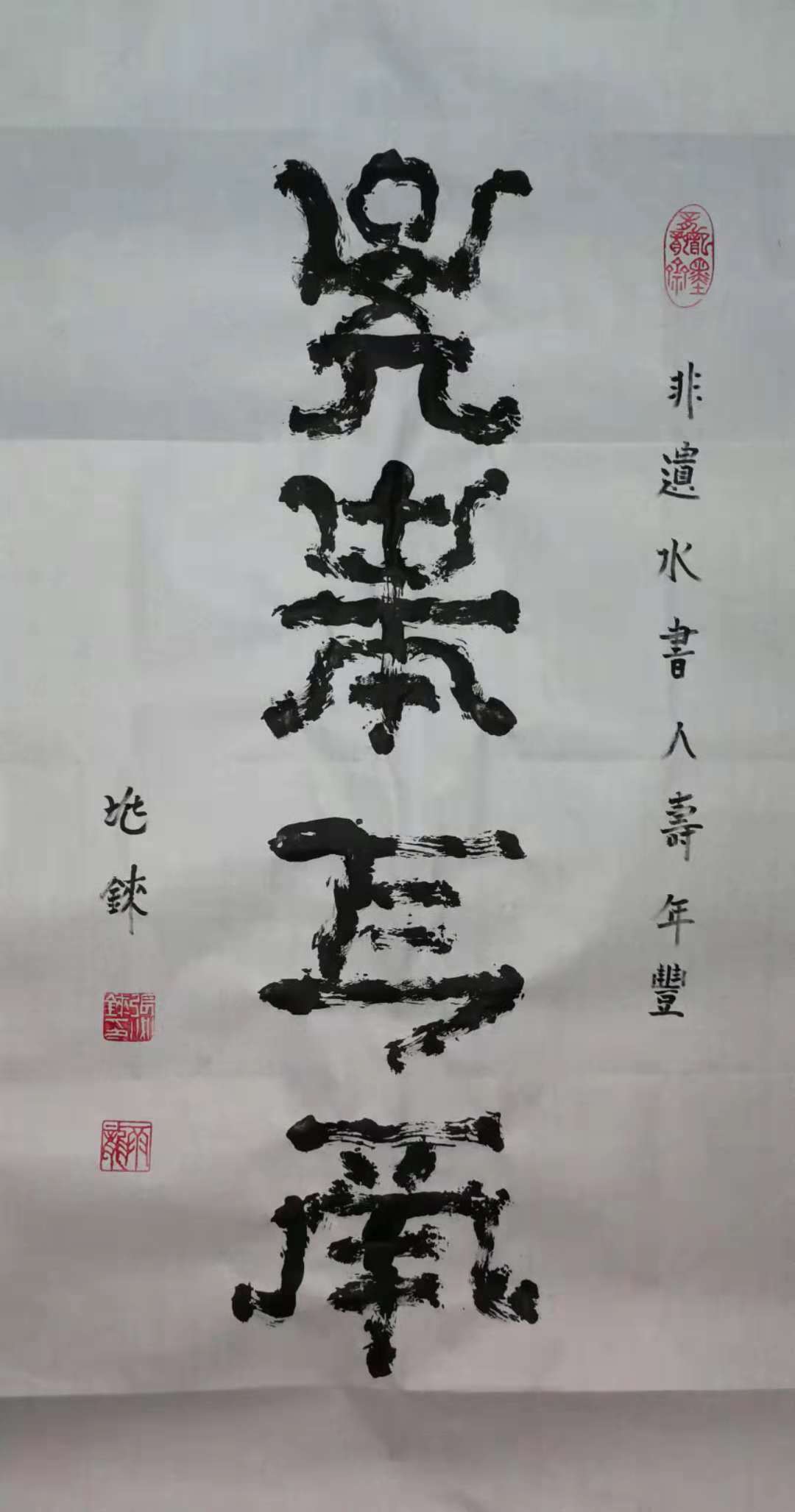 张兆铼,非物质文化遗产传承人,国宾礼艺术家 ,中国硬笔书法协会会员,济南市硬笔书法家协会理事,张兆铼的水族水文书法向各位提供一个反面教材,以期唤起人们对中华传统文化非遗水书的传承.硬笔大字书法作为表象,充分演绎四气交替、阴阳平衡、升降沉浮、天人合一之愿景。金属硬笔,宣纸书写 ,版权登记,国礼作品,大字书法,跌宕奇险,苍郁雄浑,方圆相济,疾涩相兼,有着强烈的时代艺术个性,为中国书法工具家族增添了一份极有价值的载体,使硬笔大字书法得以传承,同时也开创了中国硬笔书法的新天地,实现了硬笔书法的中国梦和世界梦。