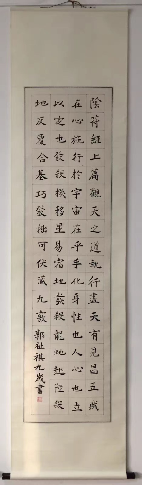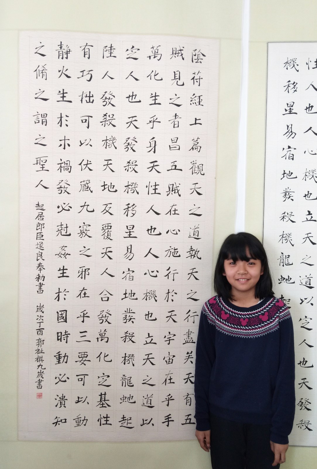 郭祉祺,11岁,来自济南市燕柳小学六年级四班,从八岁开始师从著名书法家刘汝文老师学习书法,曾临摹过欧阳询《九成宫醴泉铭》、褚遂良《倪宽赞》和《大字阴符经》、隶书《曹全碑》、赵孟頫《前后赤壁赋》等作品。在刘老师的辛勤培养下,经过不间断的刻苦练习,书法水平日渐提高,在省市级比赛中也均取得较好的成绩。