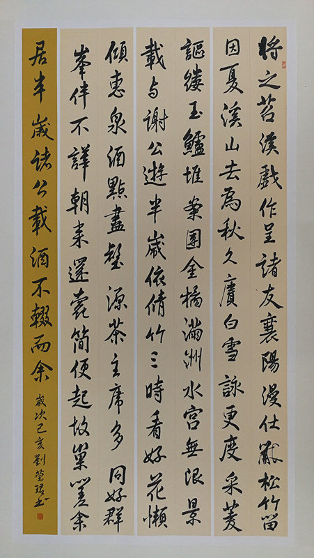 刘莹珺,济南市育秀中学初三学生,七岁起随其父刘汝文正式学习书法,先后临习楷书欧阳询《九成宫》、褚遂良《倪宽赞》《雁塔圣教序》《大字阴符经》,魏碑《张猛龙碑》,隶书《曹全碑》《礼器碑》,行书习赵孟頫《前后赤壁赋》,《集王羲之圣教序》,米芾《离骚经》《蜀素帖》《苕溪帖》,篆书《峄山碑》,草书王羲之《十七帖》,怀素《千字文》等。为进一步提高其学习兴趣,其父利用参加全国书法活动的机会,带领小莹珺访名人,识名师,先后结识了欧阳中石、庞中华、张华庆、王金泉、韦斯琴等书法大亨,并多次参加中国书协培训中心导师班听课,为的是通过耳濡目染,让莹珺从小开阔视野,从而树立书法学习的高标准,高品位。刘莹珺现为中国硬笔书法协会少儿会员,济南市“书法小名士”。