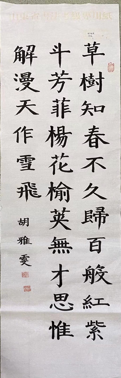 胡雅雯,13岁,就读于华东师范大学济南实验学校,性格开朗、活泼,有很多的兴趣比如:书法,舞蹈,声乐、跳绳、游泳。自七岁学习书法,曾临摹王羲之的《兰亭序》、颜真卿《颜勤礼碑》、《多宝塔碑》、隶属《乙瑛碑》,学习书法5年来,感恩遇到的每位恩师指导与帮助,书法水平不断提高,取得了许多的优异成绩,从中找到了学习的乐趣。